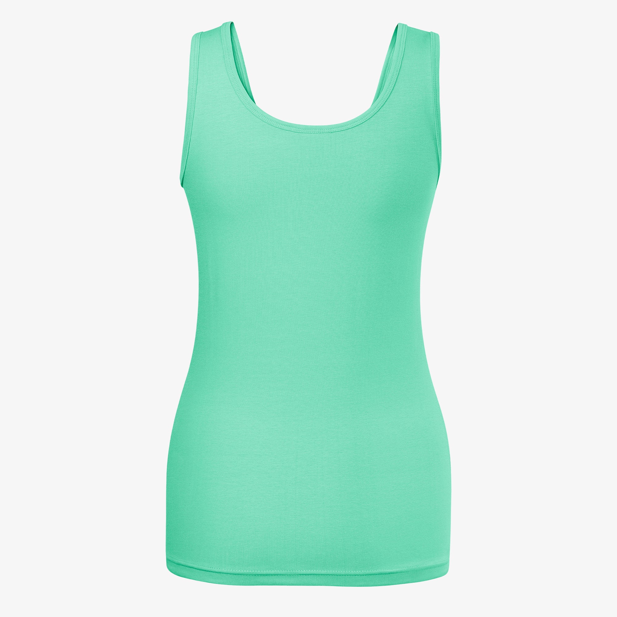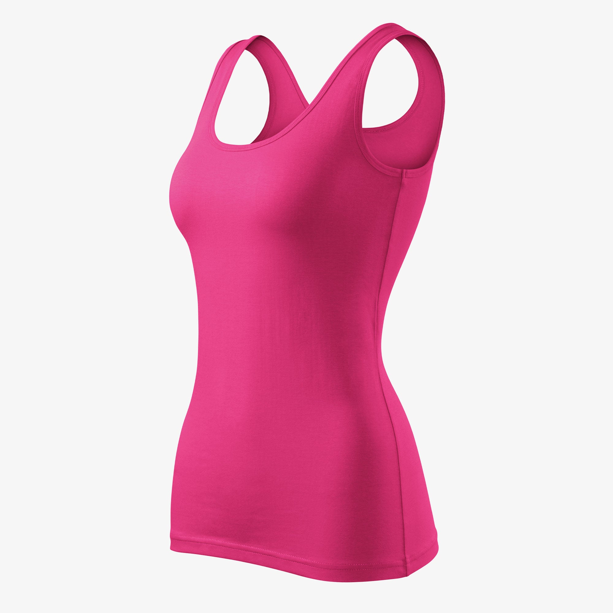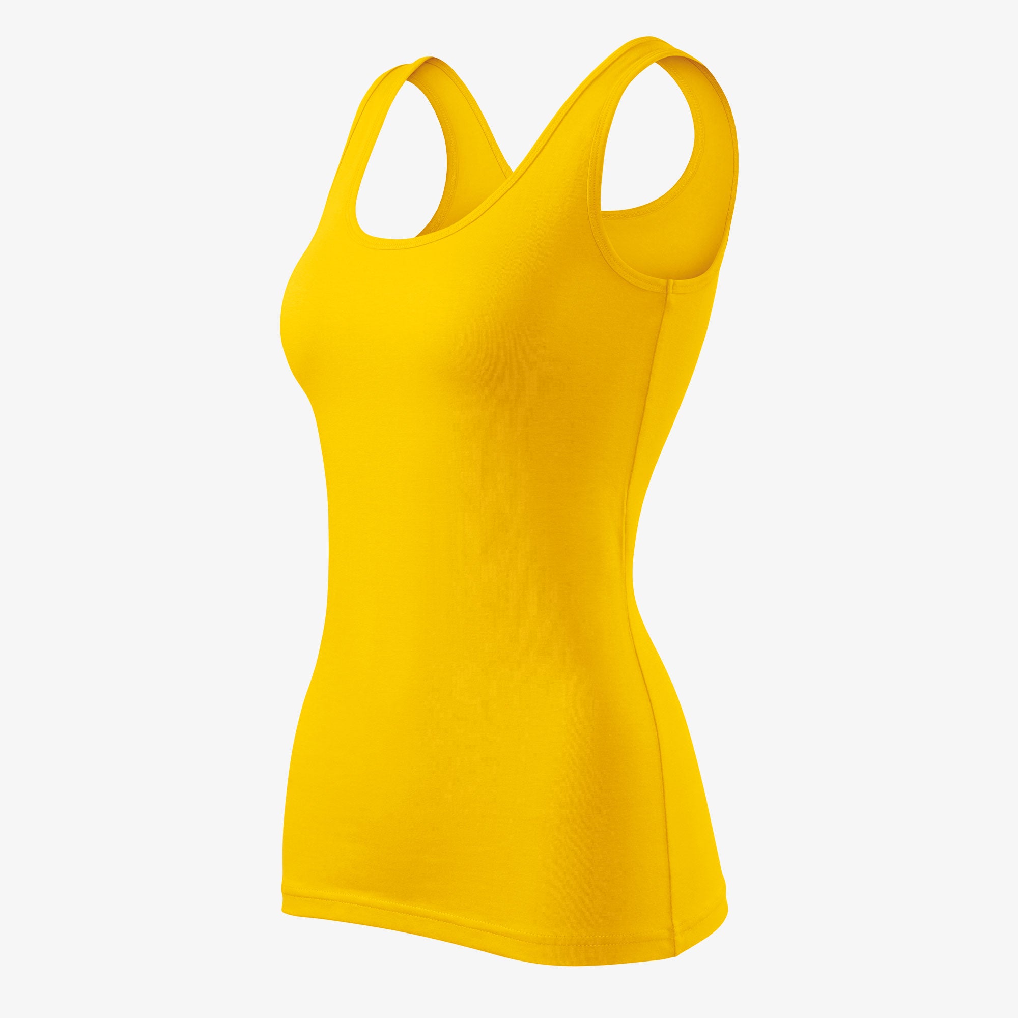 Single Jersey 180 gr/m2, 95% cotton, 5% elastane (color 12 - composition may vary - 80% cotton, 15% viscose, 5% elastane), stretchy material that ensures a stable shape, narrow cut with side seams, deep round neckline, collar and armholes with top material trim, wider shoulder straps