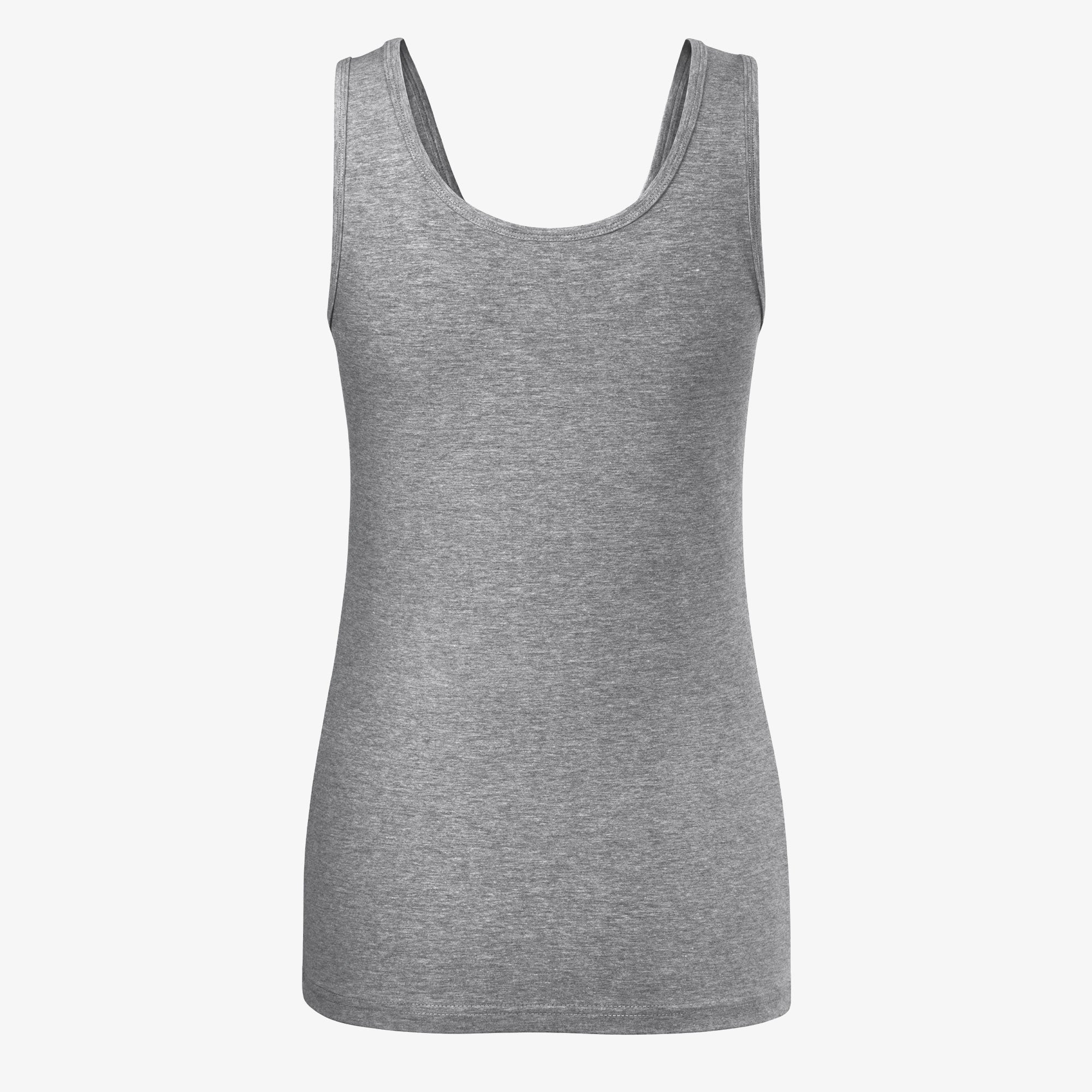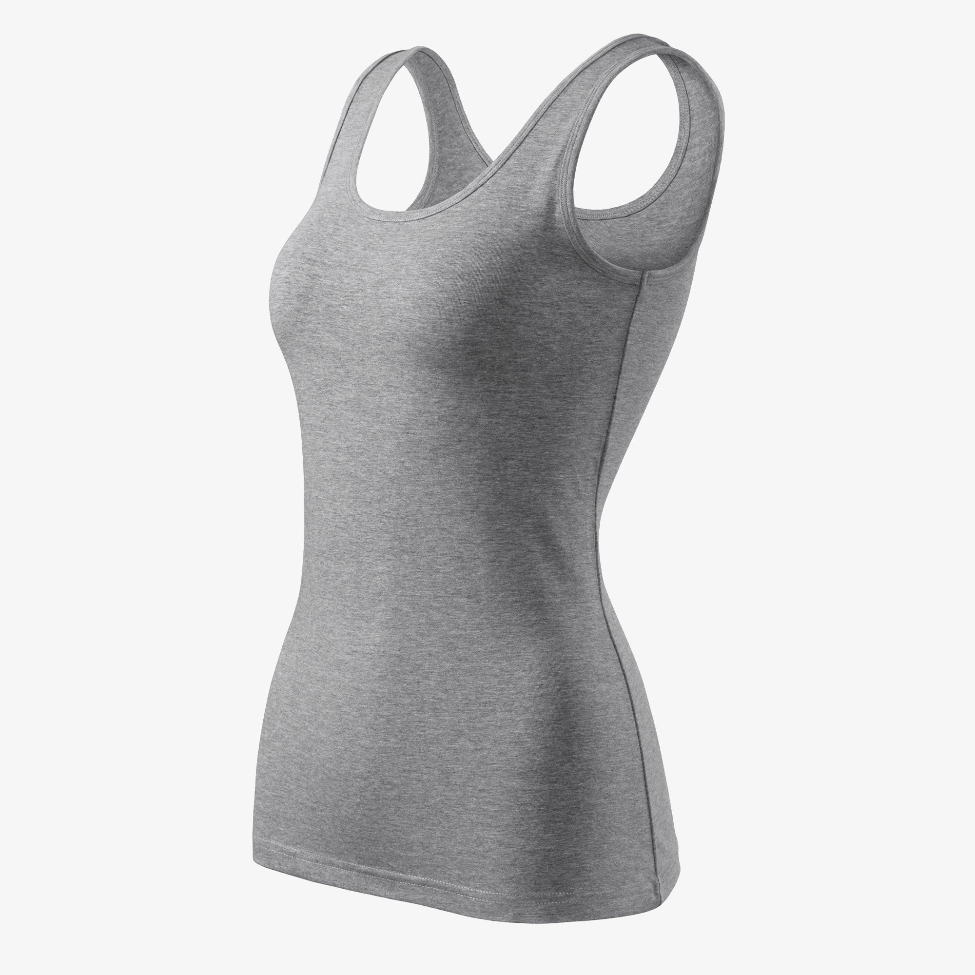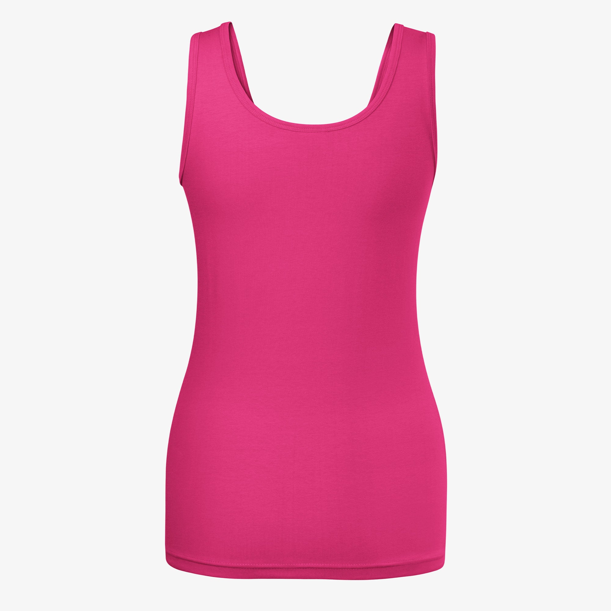 Single Jersey 180 gr/m2, 95% cotton, 5% elastane (color 12 - composition may vary - 80% cotton, 15% viscose, 5% elastane), stretchy material that ensures a stable shape, narrow cut with side seams, deep round neckline, collar and armholes with top material trim, wider shoulder straps