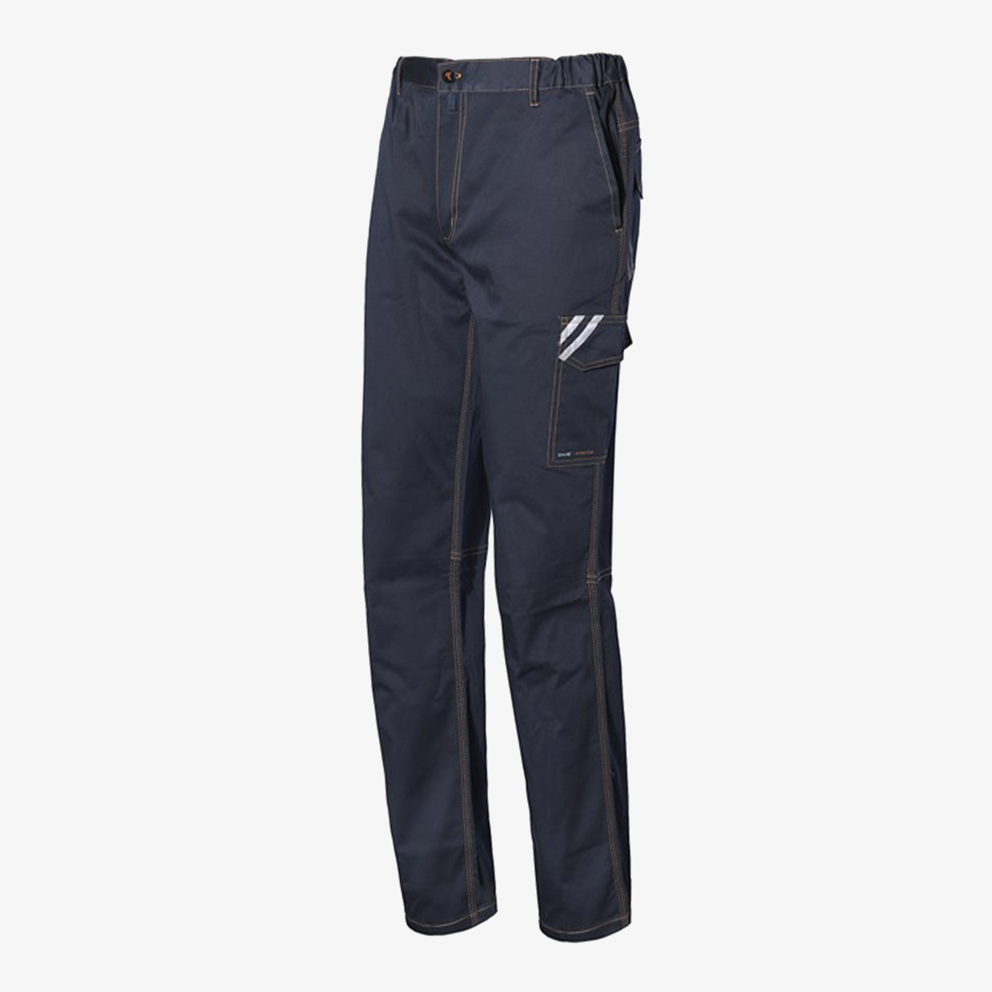 Rastezljive hlače s umetcima visoke vidljivosti, dva prednja džepa, dva stražnja džepa prekrivena preklopima, bočni džep s mijehom i džep za držač nogavica.